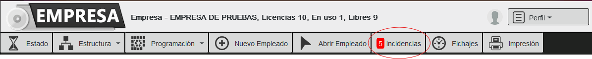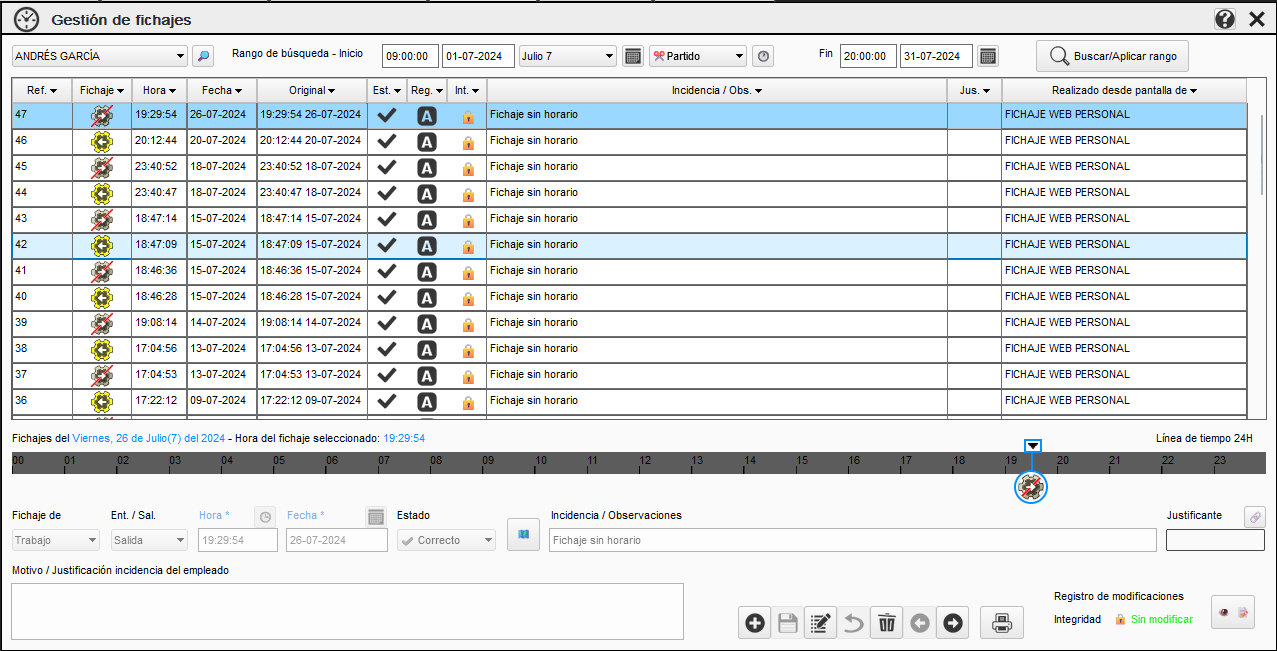 Mediante esta pantalla gestionaremos las incidencias asociadas a los fichajes de los empleados.