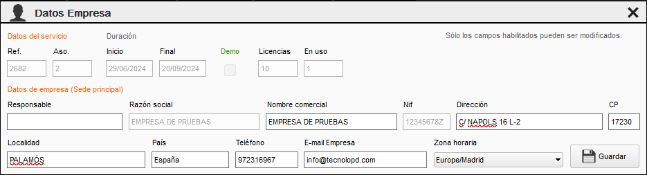 En esta pantalla gestionaremos los datos de la empresa, solo podemos modificar algunos campos, para modificar el resto debemos contactar con el administrador. Podemos destacar la información de algunos campos cómo Datos del servicio, aquí veremos la duración de nuestro contrato y el número de empleados/licencias que podemos gestionar simultáneamente. El resto de información son los datos básicos de la empresa o entidad. También es importatnte destacar la Zona horaria, debemos seleccionarla correctamente.