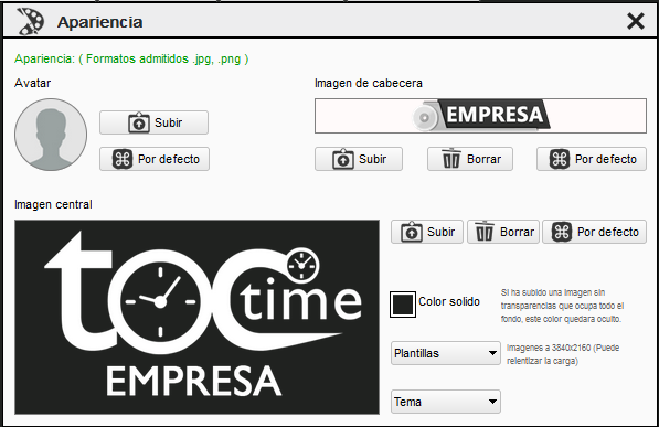 Desde esta pantalla podemos personalizar la aplicación para el perfil de la empresa o entidad. Podemos cargar un avatar o foto, un logotipo situado en la barra superior o cabecera y una imagen central o fondo de pantalla. También un color de fondo y un tema oscuro o claro.