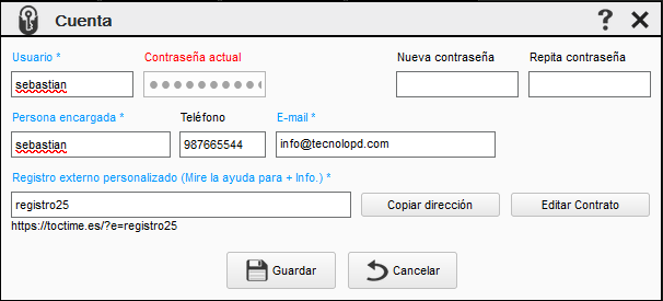 Registro externo personalizado El registro externo personalizado es una dirección que lleva a un formulario para registrarse en TocTime. Por ejemplo puede enviar dicha dirección a sus empleados para que se registren ellos mismos, al utilizar el enlace, los empleados quedarán registrados bajo su perfil de empresa. La dirección si se desea puede personalizarse pero no admite caracteres especiales ni espacios. Si lo prefiere también puede dar de alta a los empleados manualmente desde la opción Nuevo Empleado de su barra de trabajo.