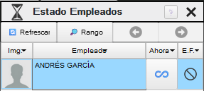 Muestra el estado actual de los empleados basándose en el último fichaje encontrado o realizado dentro del rango de búsqueda establecido. Por defecto el rango se establece en el día actual para cierto horario, si dicho horario no coincide con el de sus empleados deberá ajustarlo.