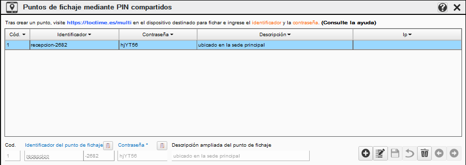 Crear un punto de fichaje Para crear un punto de fichaje pulse en el botón nuevo, especifique un identificador, la contraseña y la descripción del identificador si lo desea, a continuación pulse en guardar.