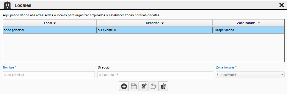 Con la opción Locales gestionaremos las diferentes sedes de la entidad junto con su zona horaria independiente.