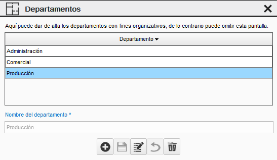 En Departamentos daremos de alta las diversas áreas de la entidad, solo con fines organizativos.
