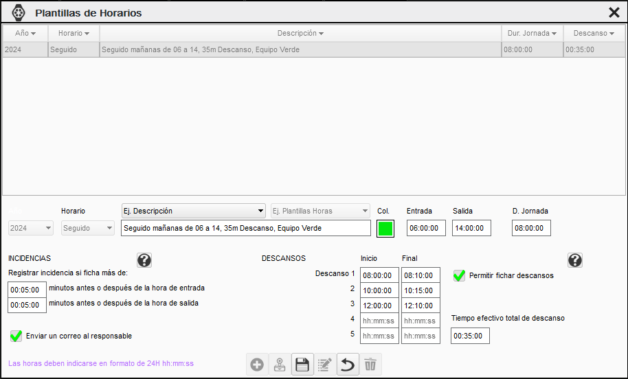 Dispone de un desplegable que le permitirá insertar de forma automática las horas de inicio y final de cada turno mediante plantillas.