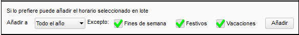 En este apartado puede seleccionar un horario creado anteriormente, este se mostrará en el desplegable, una vez seleccionado debe añadirlo al calendario mediante el botón Añadir. Dispone de varias opciones para facilitar el añadido sobre el calendario: