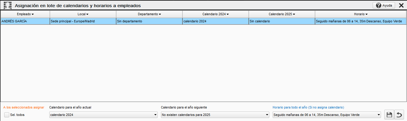 Desde esta pantalla podemos asignar en lote los calendarios y los horarios de los empleados.