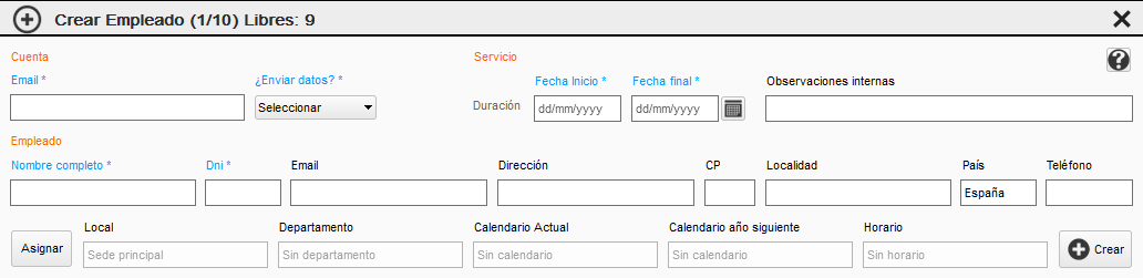 Desde esta pantalla daremos de alta los empleados que deben fichar. Los campos azules son importantes, se utilizan para crear la cuenta de acceso, el periodo de acceso, el nombre y DNI empleado en los fichajes. También podemos asignar al empleado un local o lugar de trabajo, departamento, calendario de la empresa y horario de entrada salida.