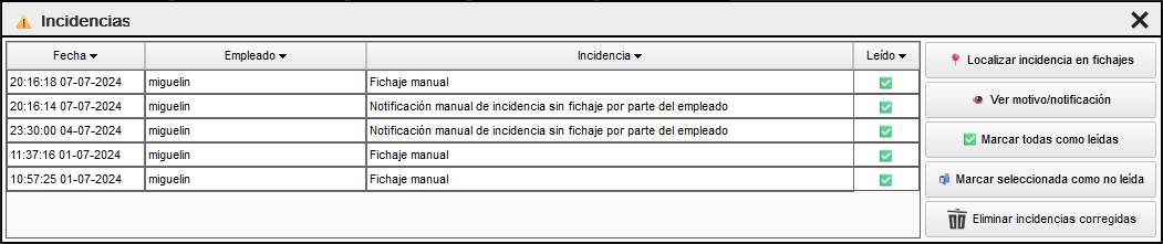 En esta pantalla gestionaremos las diferentes incidencias, accediendo a su fichaje o motivo, marcarlas como leídas o eliminarlas.