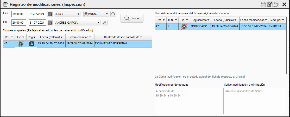 Esta pantalla es una muestra del registro de modificaciones, podemos ver los datos originales y los cambios realizados en los fichajes.