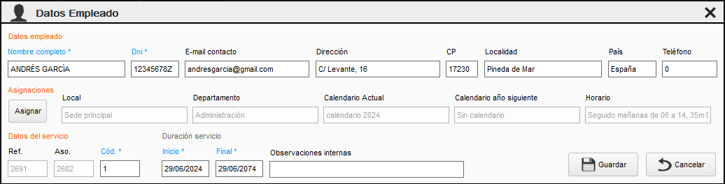 En esta pantalla podemos modificar los datos básicos de los empleados y asignarles un local o lugar de trabajo, departamento, calendario de la empresa y horario de entrada salida.