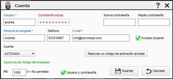 En esta pantalla podemos modificar los datos de acceso de los empleados. El campo usuario y contraseña se utiliza para fichar. El check ACCESO AL PANEL activa o desactiva el acceso del empleado a la aplicación, no desactiva el fichaje. El campo CUENTA activa o desactiva el acceso del empleado a la aplicación y a los fichajes. El botón REENVIAR CÓDIGO DE ACTIVACIÓN envía un email al empleado para que confirme su email y active su cuenta de nuevo. El campo PIN se utiliza para fichar con un PIN, si es 0 estará desactivado. El check USUARIO Y CONTRASEÑA activa o desactiva el fichaje con usuario y contraseña.