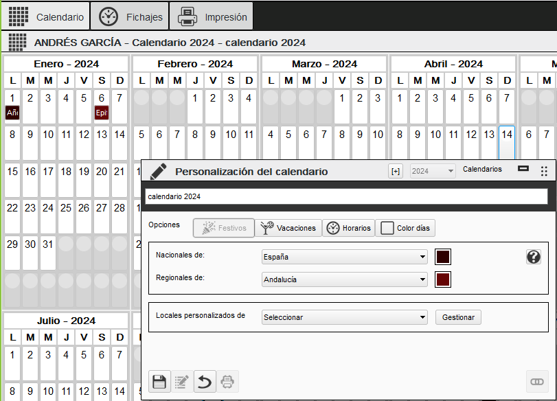 Desde esta pantalla podemos personalizar el calendario del empleado, modificar este calendario no es obligatorio, solo lo haremos por ejemplo si este empleado tiene unas vacaciones diferentes a las de la empresa.
