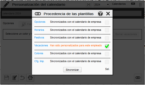 Esta pantalla le indica que apartados están sincronizados con los del calendario de la empresa o si disponen de un registro propio personalizado del empleado.