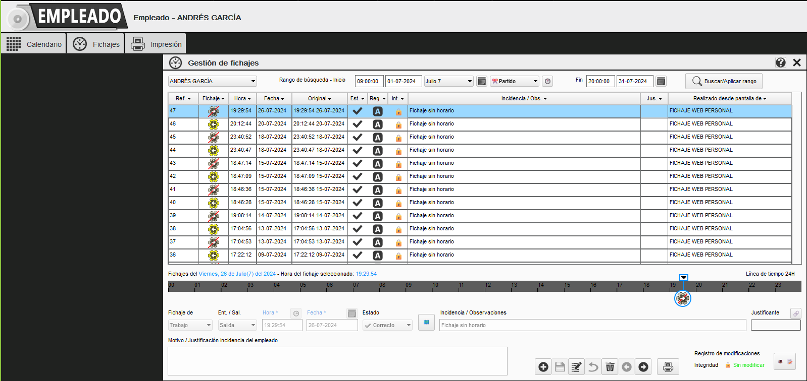 Desde esta pantalla podemos gestionar los fichajes del empleado, es igual que la explicada anteriormente, pero en este caso ya tenemos seleccionado el empleado.