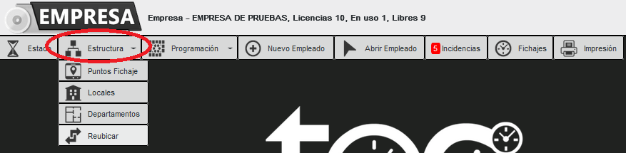 Este menú contine varias opciones: Puntos fichaje, se trata de un dispositivo ubicado en algún lugar de la empresa desde donde los empleados fichan con PIN. Desde Locales gestionaremos las sedes de la entidad. En Departamentos daremos de alta las diversas áreas de la entidad, p. ej. contabilidad, recursos humanos, etc. En Reubicar podemos cambiar los empleados de local o departamento fácilmente.
